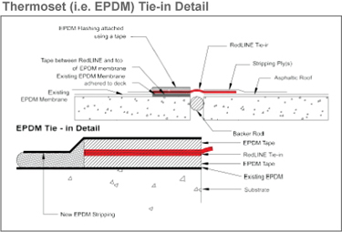 RedLINE® Tie-in is a dual roof membrane tie-in system. It effectively solves the problem of single ply roof membrane connections to other incompatible roof systems. The RedLINE® Tie-in material is specially formulated to provide a long term performance solution to cross roofing system compatibility, specifically Built-Up-Roofing, Coal Tar Pitch, Modified Bitumen, Hot Rubberized Asphalt, Spray Polyurethane Foam and Epoxy Resin. The RedLINE® Tie-in is comprised of a continuous material strip which is compounded of a specially formulated elastomer with polyester fleece embedded in the salvage edge on one side. RedLINE® Tie-in is supplied directly to the job site in a roll with all detail work done and seamed together by a proprietary vulcanizing process, which results in monolithic and elastic seamed joints. Seaming can also be done on site if required. For the membrane tie-in configuration, a specially manufactured RedLINE® material is used. The RedLINE® material typically has polyester fabric embedded one of the salvage edges (top and bottom surfaces). This salvage edge, is the edge that is embedded into the asphalt/bitumen roof side. The other salvage edge depending on the membrane that is being tied in, this salvage edge will either be smooth or have fleece. The fleeced edge can be attached to a PVC roof using a proprietary sealant while attachment to an EPDM roof membrane is done by using the factory attached peel back tape on a smooth edge. Both methods of attachment result in a waterproof, zero profile tie-in detail, which can be installed in minutes on a roof. |